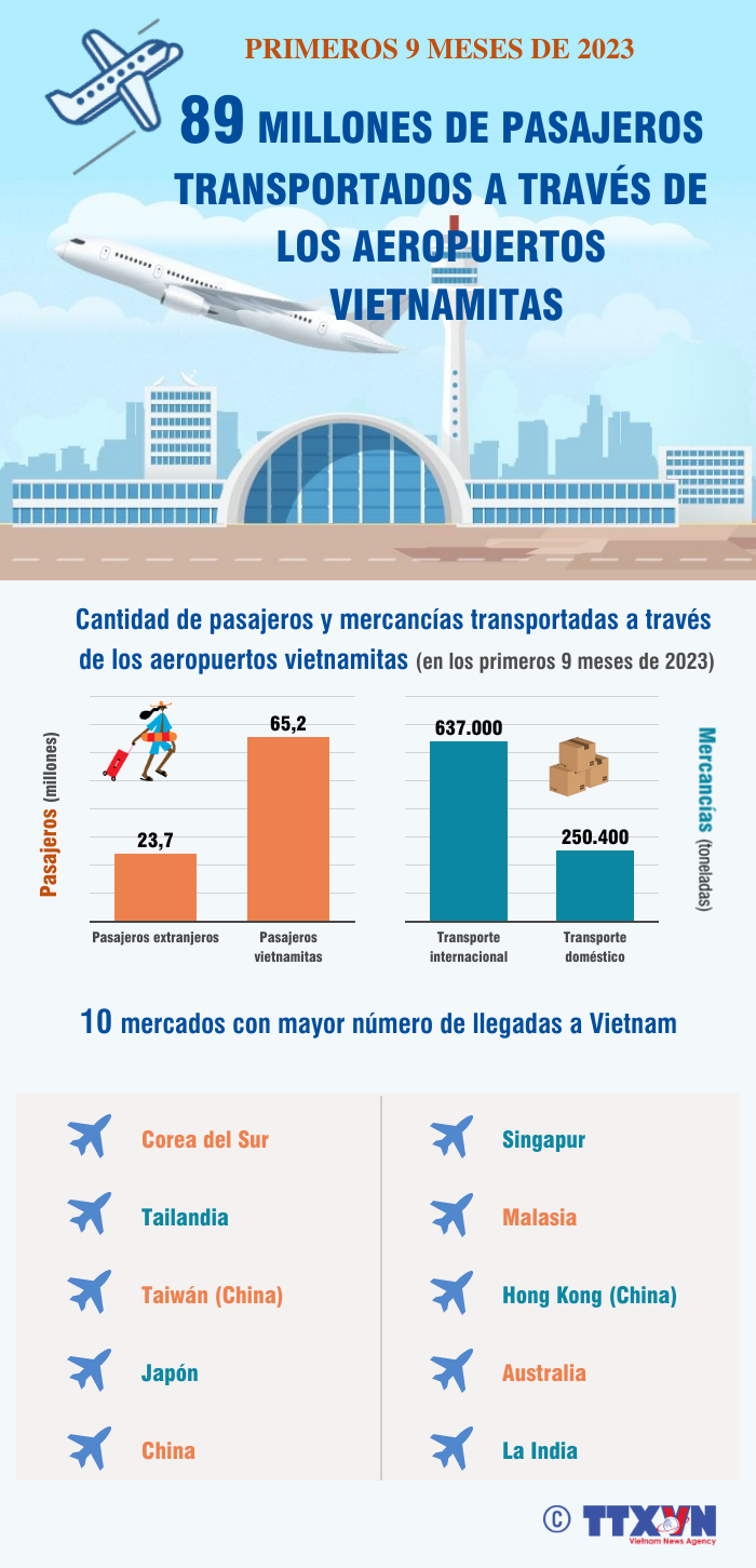 Según las estadísticas de la Administración de Aviación de Vietnam, dependiente del Ministerio de Transporte, en los primeros nueve meses de 2023, los aeropuertos vietnamitas recibieron a 89 millones de pasajeros, un aumento del 20 por ciento con respecto al mismo período de 2022.