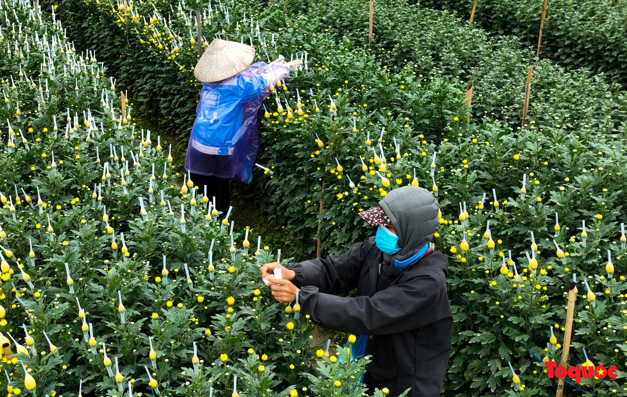 | Agricultores de la comuna de Dai Thinh cuidan los campos de crisantemos. |