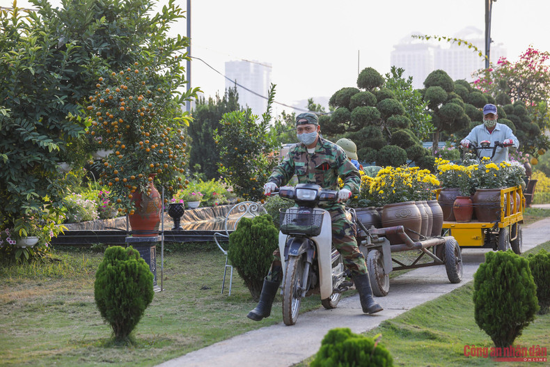 | Para llevar al mercado de Tet hermosos kumquats en macetas, los jardineros se han esforzado por cuidarlos durante todo un año. Especialmente los melocotoneros requieren una mayor atención. |