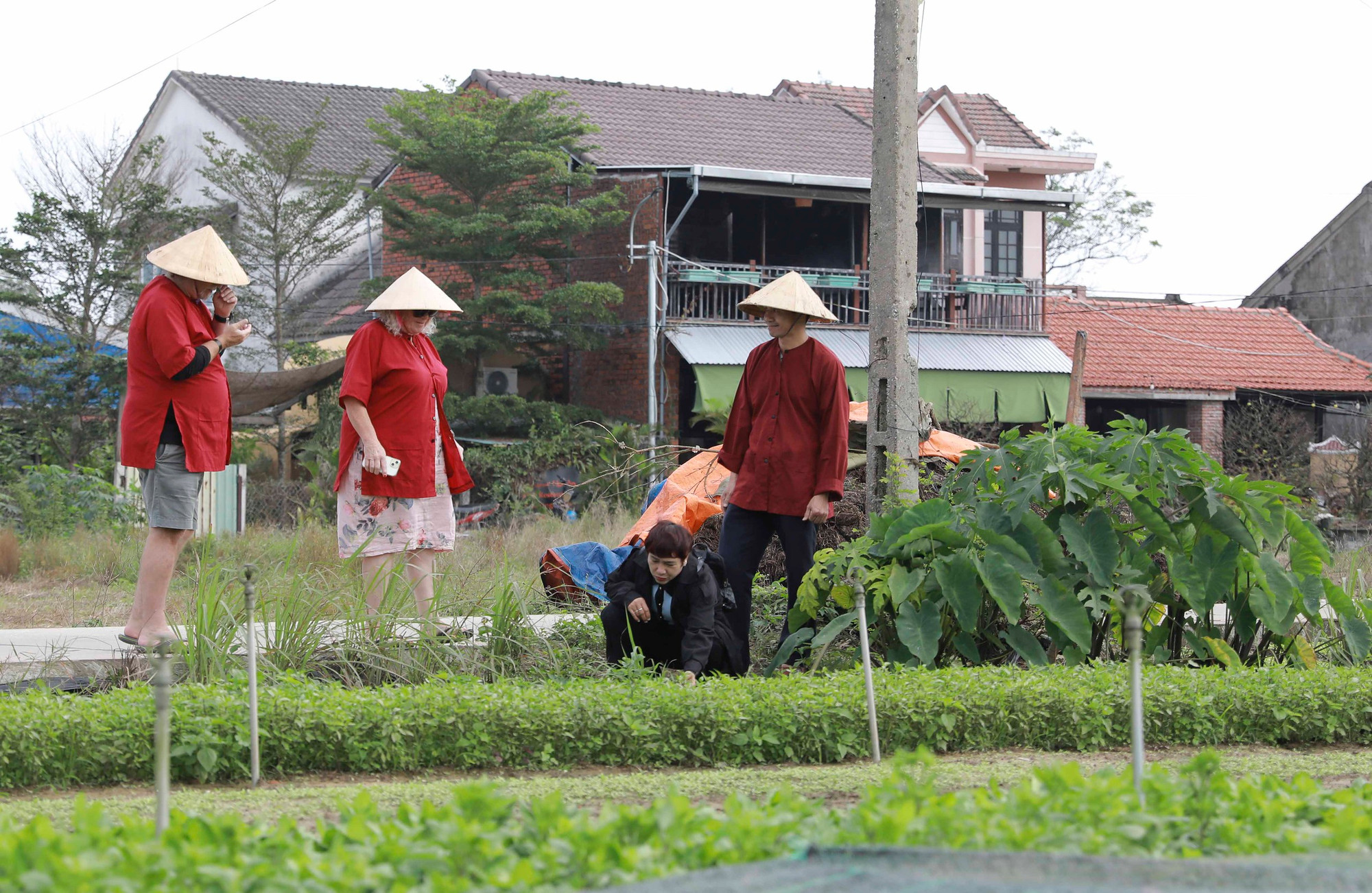 | Turistas extranjeros aprenden las prácticas locales de cultivo. |