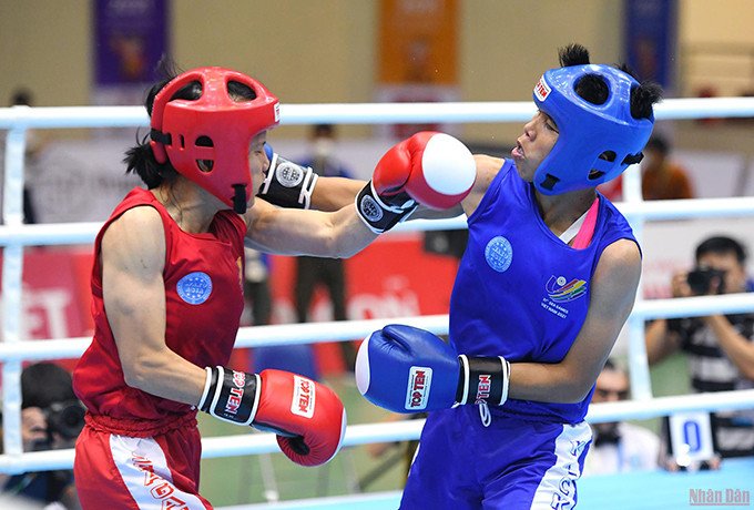 Huynh Thi Kim Vang (rojo) y la atleta filipina Ngana PagaZephania (azul) en la categoría de Fullcontact, menos de 65 kilogramos.