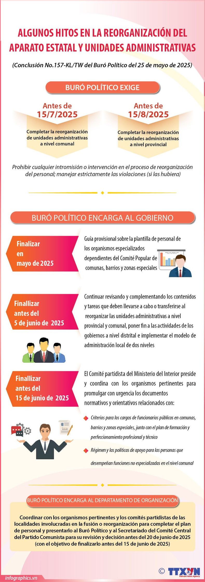 El Buró Político exige que las nuevas entidades administrativas a nivel comunal entren en funcionamiento a partir del 1 de julio, con el objetivo de completar este proceso antes del 15 del mismo mes. A nivel provincial, se prevé completar la reorganización antes del 15 de agosto.