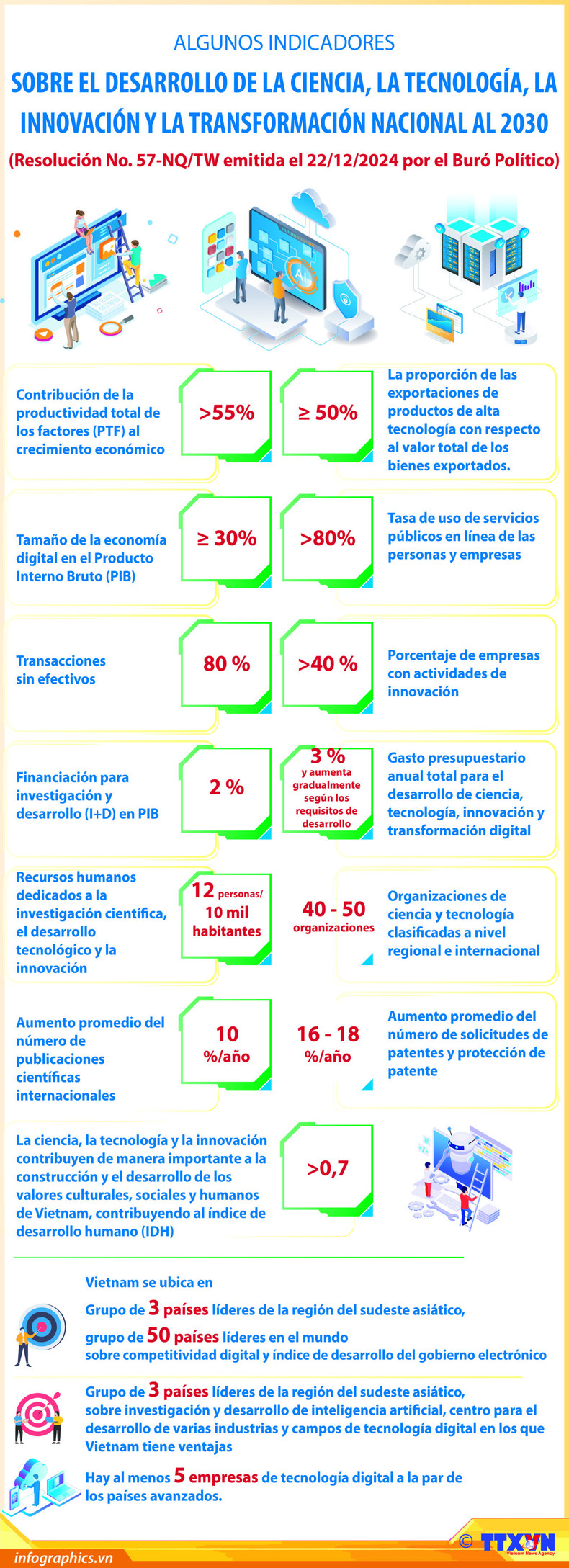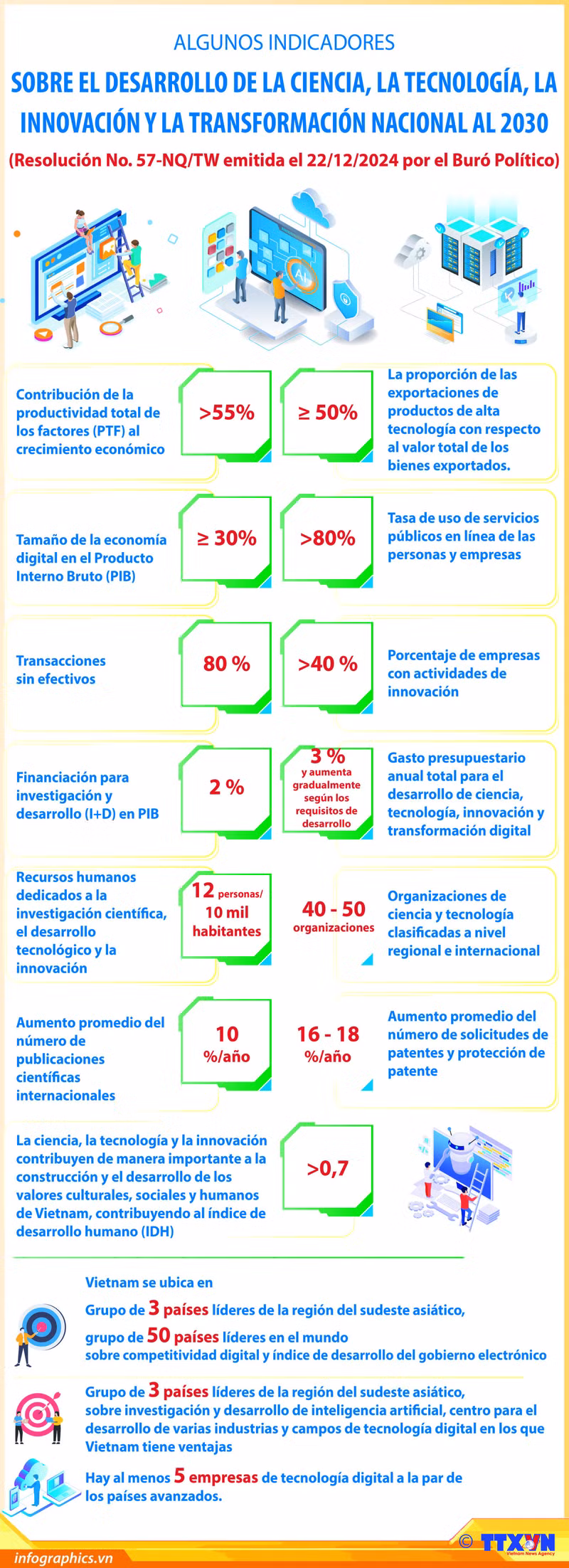 Se espera que para 2030, el potencial y el nivel de ciencia, tecnología e innovación de Vietnam alcance un nivel avanzado en muchos campos importantes y se ubicará en el grupo líder entre los países de ingresos medianos altos.