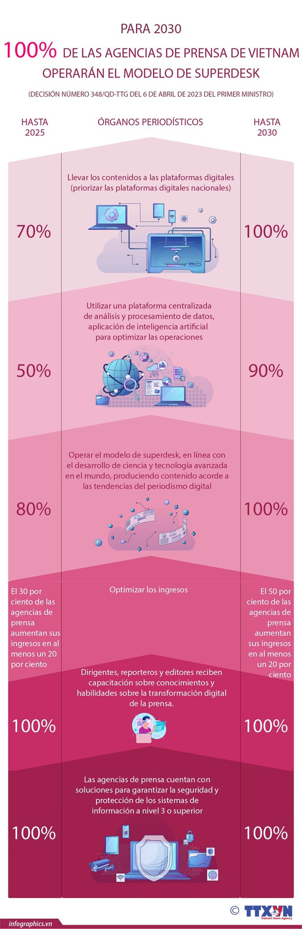 Según la Decisión número 348/QD-TTG del 6 de abril de 2023 del primer ministro, el cien por ciento de las agencias de prensa de Vietnam operarán el modelo de superdesk.