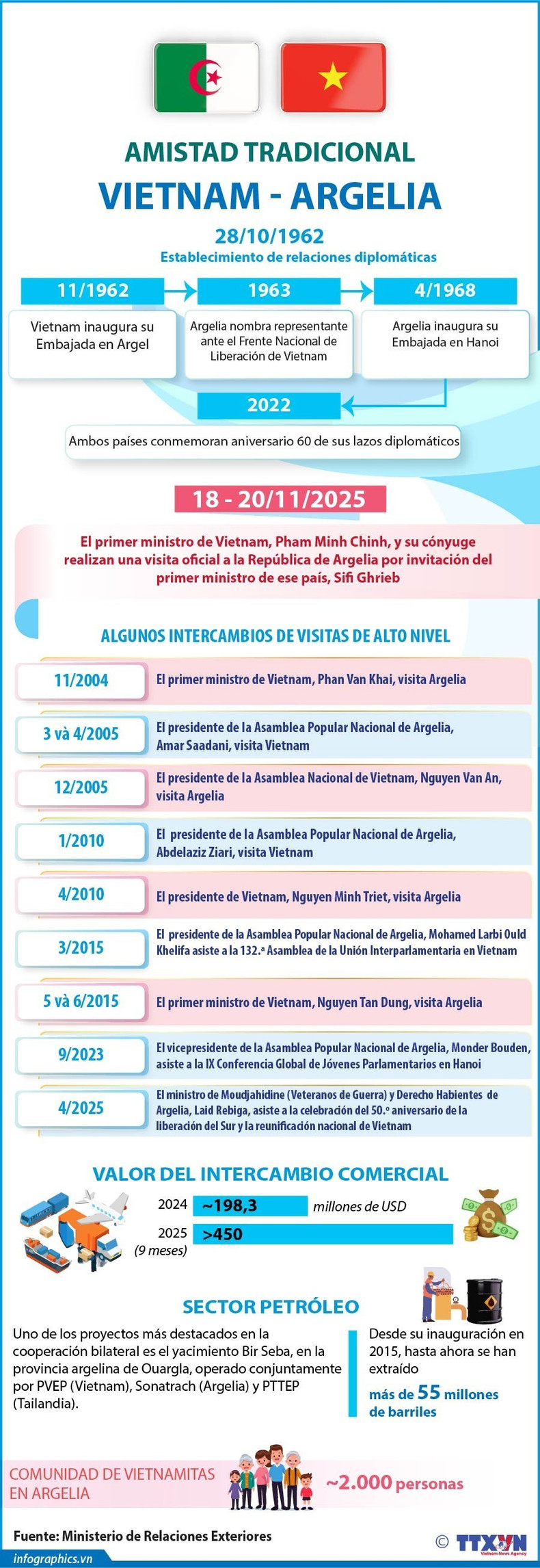 El primer ministro de Vietnam, Pham Minh Chinh, acompañado de su cónyuge y de una delegación de alto nivel, realiza del 18 al 20 de noviembre una visita oficial a Argelia, en cumplimiento de una invitación de su homólogo anfitrión, Sifi Ghrieb.