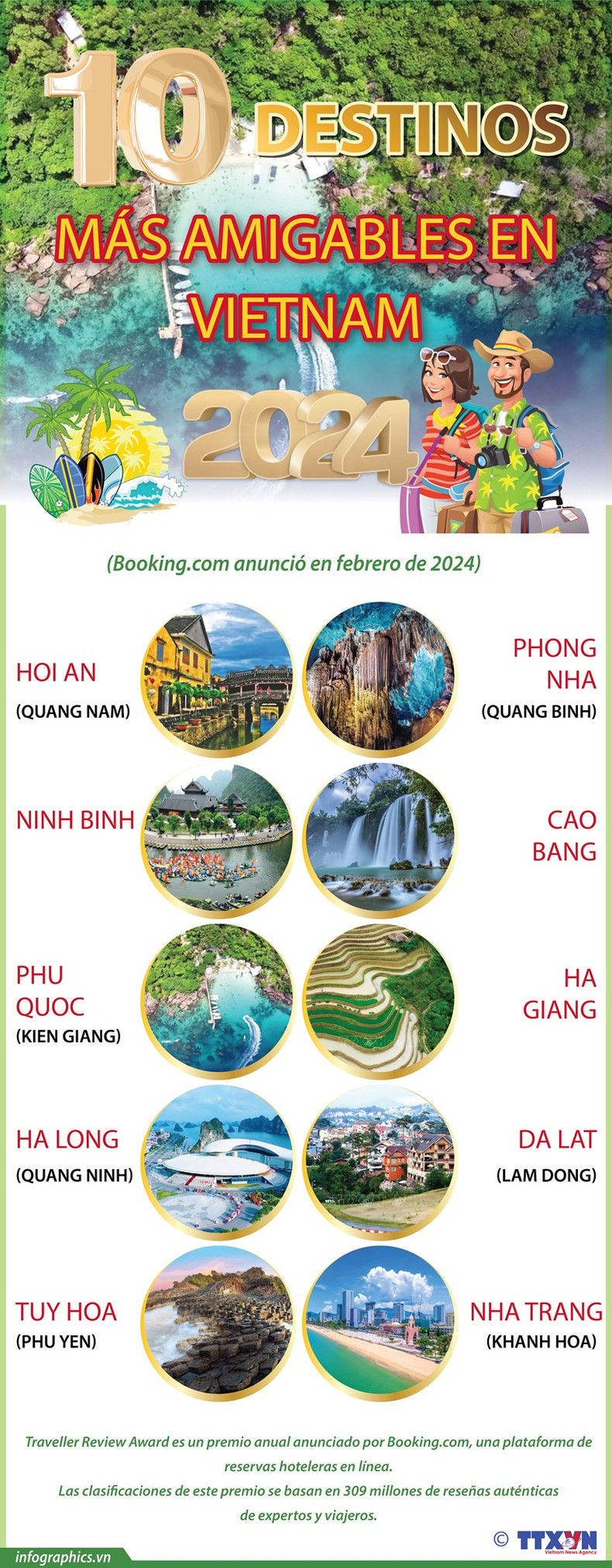 La plataforma de reservas hoteleras en línea booking.com recién anunció el ranking de los 10 destinos más amigables de Vietnam, una categoría en el marco de los premios Traveller Review Awards 2024. Como resultado, encabeza la lista la ciudad antigua de Hoi An (Quang Nam), seguida por el Parque Nacional de Phong Nha-Ke Bang (Quang Binh).