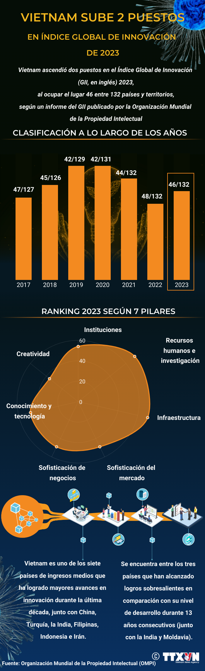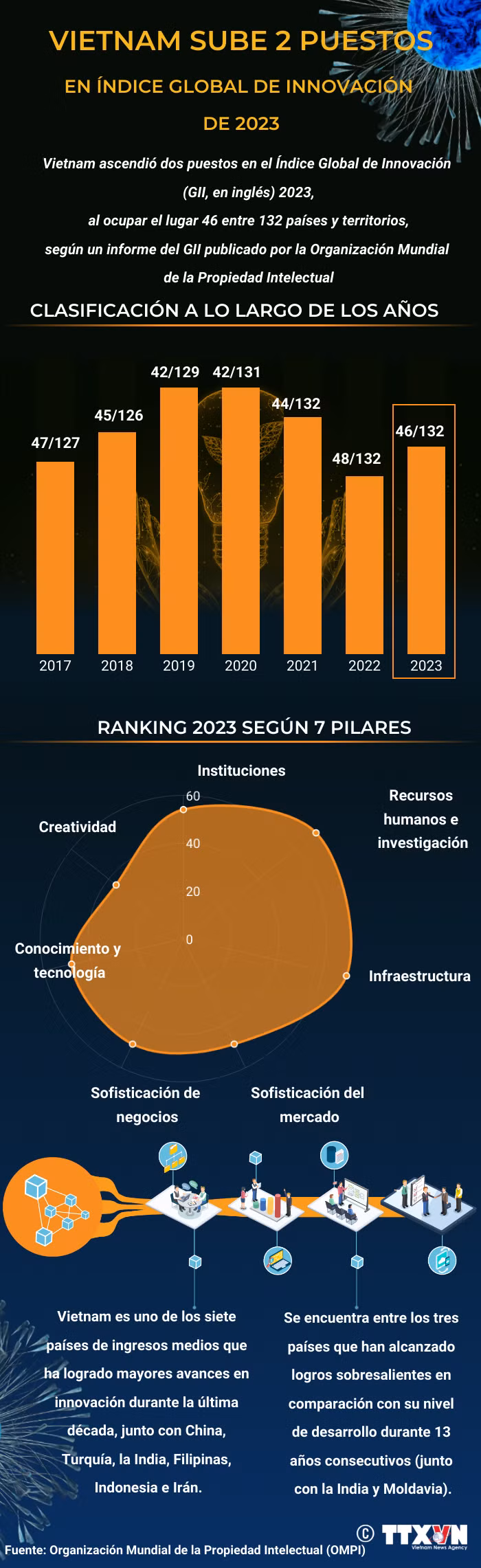 Según el Informe del Índice Global de Innovación 2023, Vietnam ocupa el puesto 46 entre 132 países y economías, dos lugares por encima del puesto registrado en 2022.