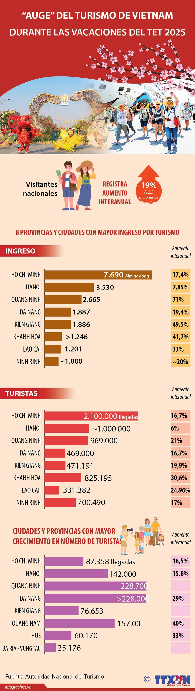 Durante el Año Nuevo Lunar 2025 (del 25 de enero al 2 de febrero de 2025), la industria del turismo atendió a 12,5 millones de visitantes nacionales (un aumento interanual de alrededor del 19 por ciento). Mientras tanto, el número de turistas extranjeros también creció en un promedio del 30 por ciento.