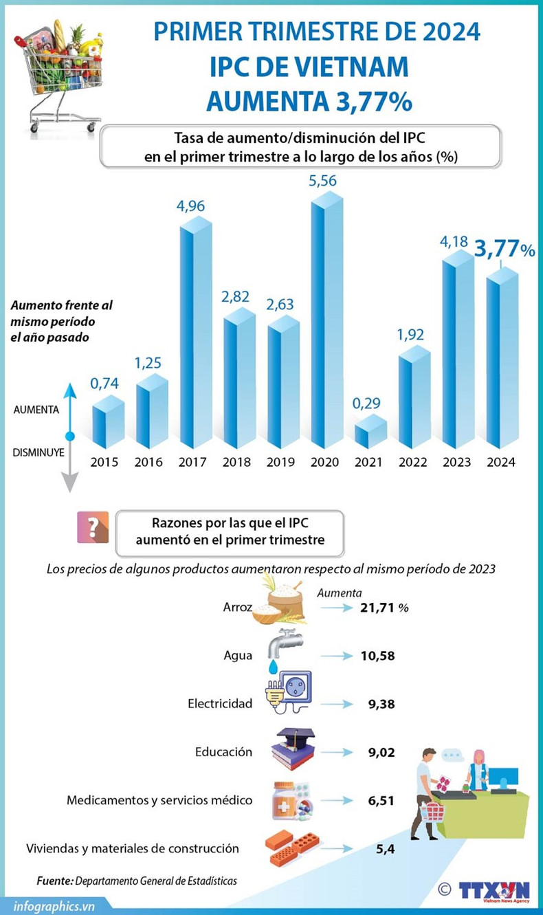 En el primer trimestre de 2024, el Índice de Precios al Consumidor (IPC) en Vietnam aumentó un 3,77 por ciento con respecto al mismo período de 2023 debido a los aumentos de los precios internos del arroz y los índices de precios de electricidad, agua, educación y atención sanitaria.