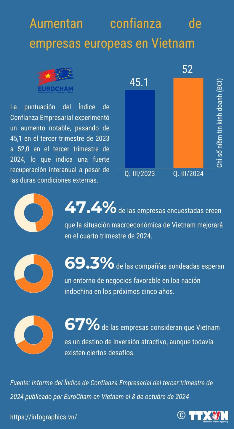 El Índice de Confianza Empresarial correspondiente al tercer trimestre de 2024, publicado hoy por la Cámara de Comercio Europea (EuroCham) en Vietnam refleja una tendencia positiva a pesar de los desafíos económicos planteados por el tifón Yagi y los obstáculos operativos.