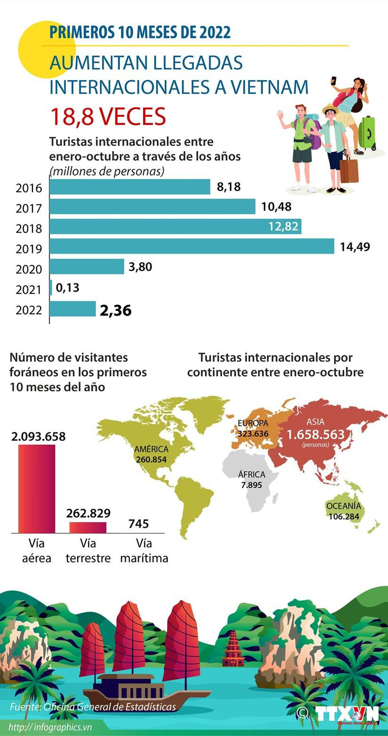 Vietnam recibió a cerca de 17,2 millones de turistas extranjeros entre enero y octubre, un 21,5 por ciento más que el año pasado, lo que refleja un buen ritmo de cara a la temporada alta de fin de año, según informó hoy la Autoridad Nacional de Turismo de Vietnam.