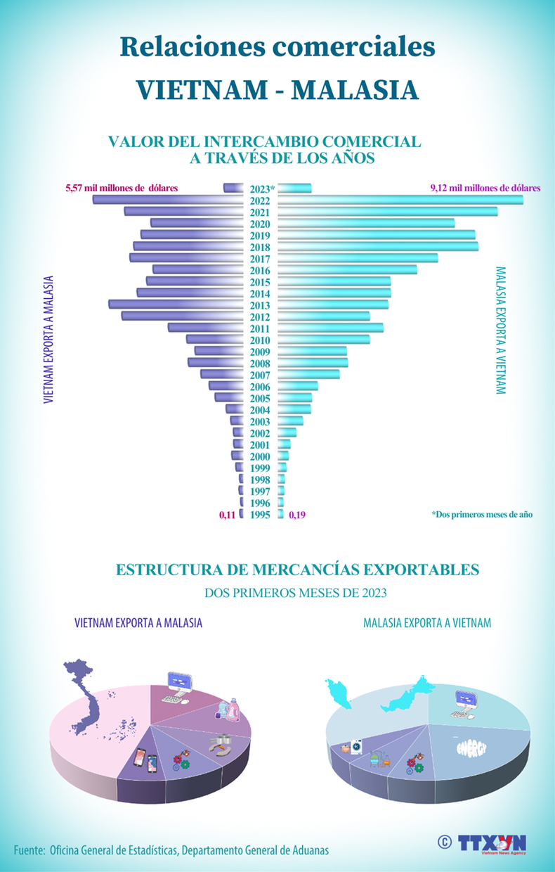 Solo en los dos primeros meses de 2023, el valor del intercambio comercial entre Vietnam y Malasia alcanzó los 1,94 mil millones de dólares, equivalente al 13 por ciento de todo el año 2022.