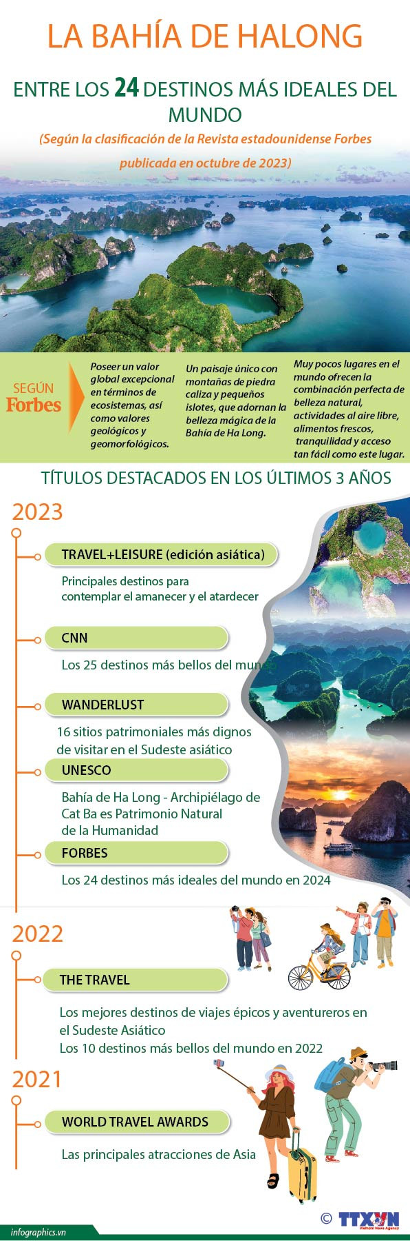 La bahía de Ha Long en Vietnam se encuentra en la lista los 24 destinos más ideales del mundo en 2024, según la clasificación de OvationNetwork, red líder mundial de agencias especializadas en turismo de lujo y experiencial, publicada por la revista estadounidense Forbes.