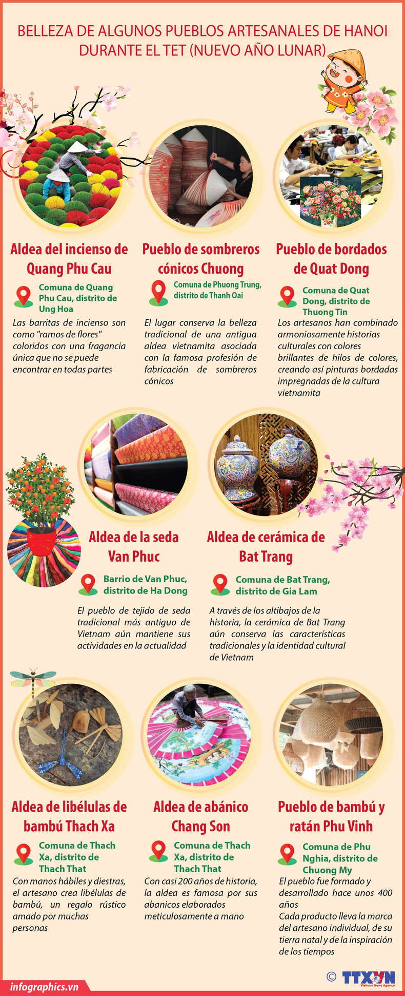 En ocasión del Tet (Nueve Año Lunar) y primavera, los turistas pueden llegar a la aldea de incienso Quang Phu Cau, la de sombreros cónicos Chuong, la de bordados Quat Dong y la de seda Van Phuc. Según las estadísticas, Hanói tiene actualmente mil 350 pueblos artesanales y cada uno tiene su propia identidad y productos únicos y sofisticados impregnados de identidad cultural nacional.