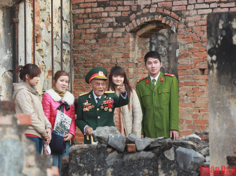 | Un veterano revolucionario, con un libro sobre el General Vo Nguyen Giap en la mano, cuenta a los jóvenes sobre el ingenioso estratega militar vietnamita. |