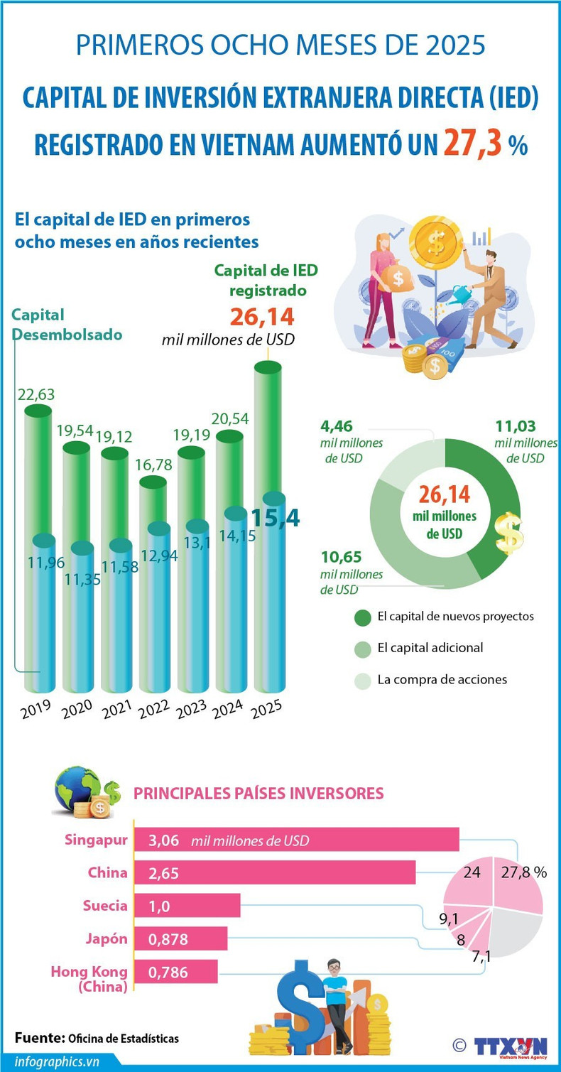 En los primeros ocho meses del año, Vietnam ha continuado atrayendo fuertemente la IED con un valor total registrado de 26,14 mil millones de dólares, un 27,3 por ciento más que en el mismo período de 2024.