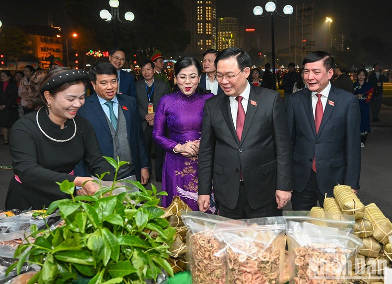 | El máximo dirigente legislador y los delegados visitan la exhibición de productos agrícolas en la provincia de Thai Nguyen. |