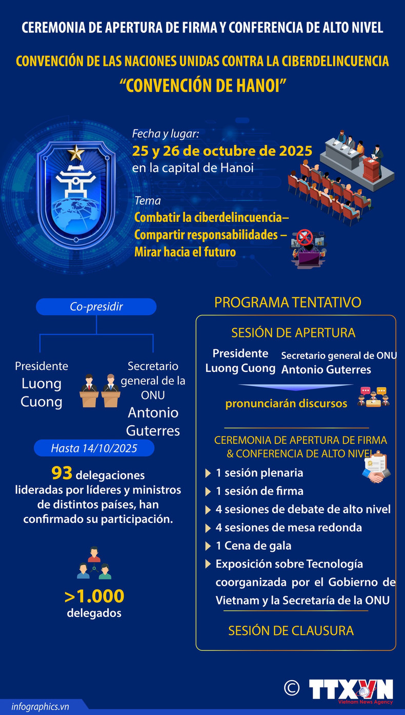 Vietnam será el país anfitrión de la ceremonia de apertura de la firma y la conferencia de alto nivel sobre la Convención de las Naciones Unidas contra la ciberdelincuencia - la “Convención de Hanói”— bajo el lema “Combatir la ciberdelincuencia – Compartir responsabilidades – Mirar hacia el futuro”, que se llevará a cabo en la capital, Hanói, los días 25 y 26 de octubre de 2025.