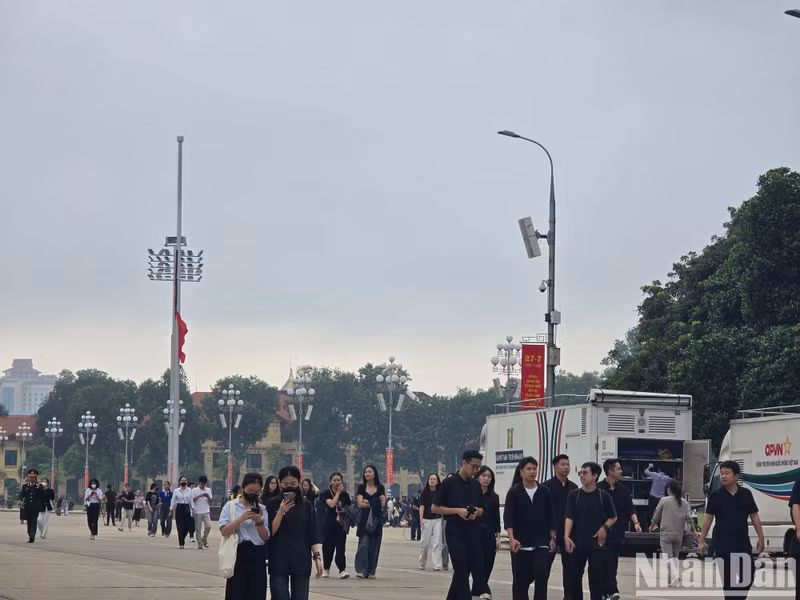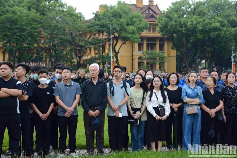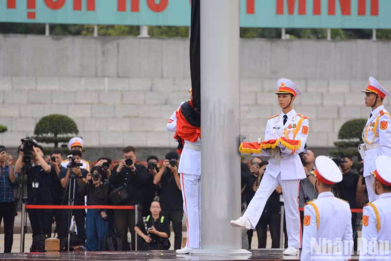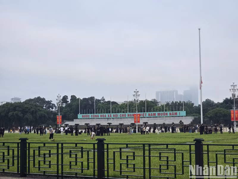 La ceremonia de izamiento de bandera nacional a media asta tuvo lugar a las 6:00 horas de hoy en la plaza Ba Dinh en señal de duelo nacional por la defunción del secretario general del Partido Comunista de Vietnam, Nguyen Phu Trong. Miles de personas acudieron a la zona del Mausoleo de Ho Chi Minh para rendir tributo al exinto líder.