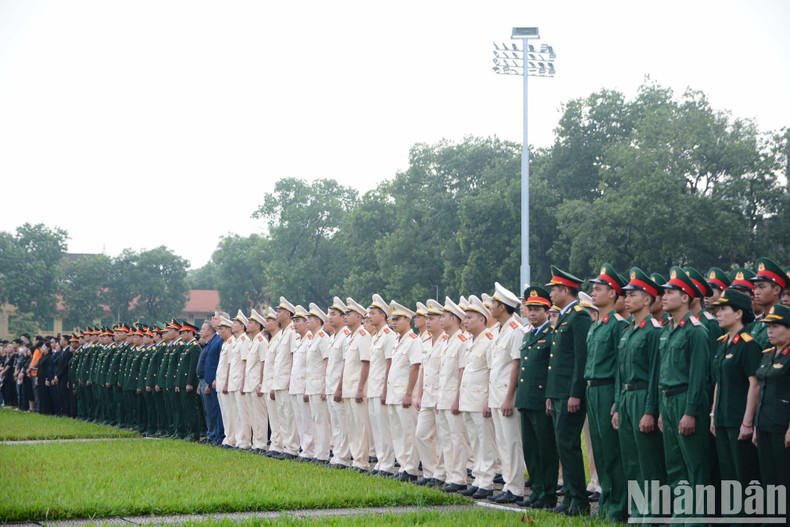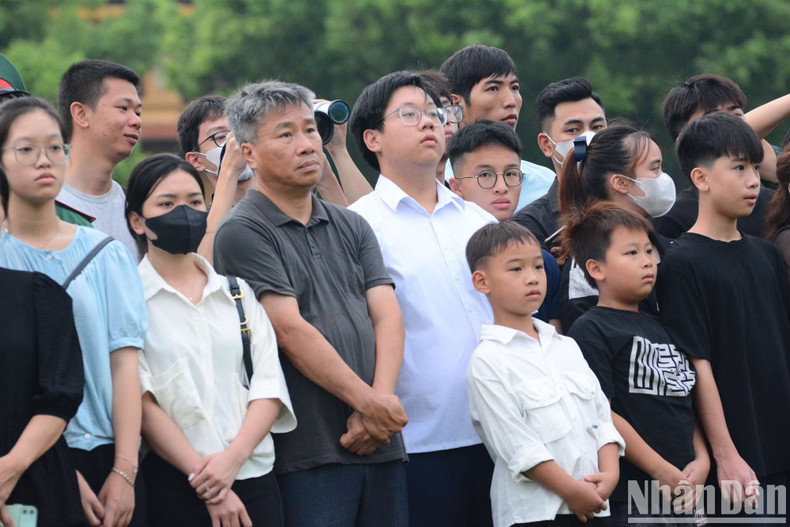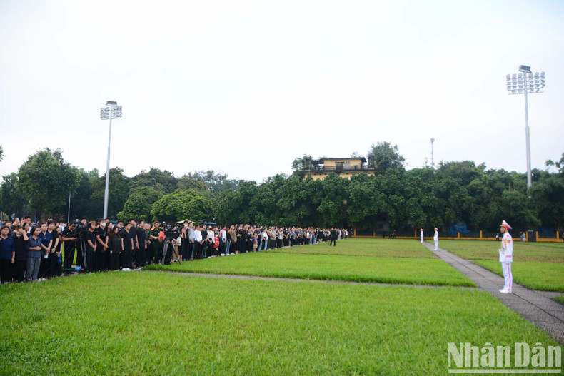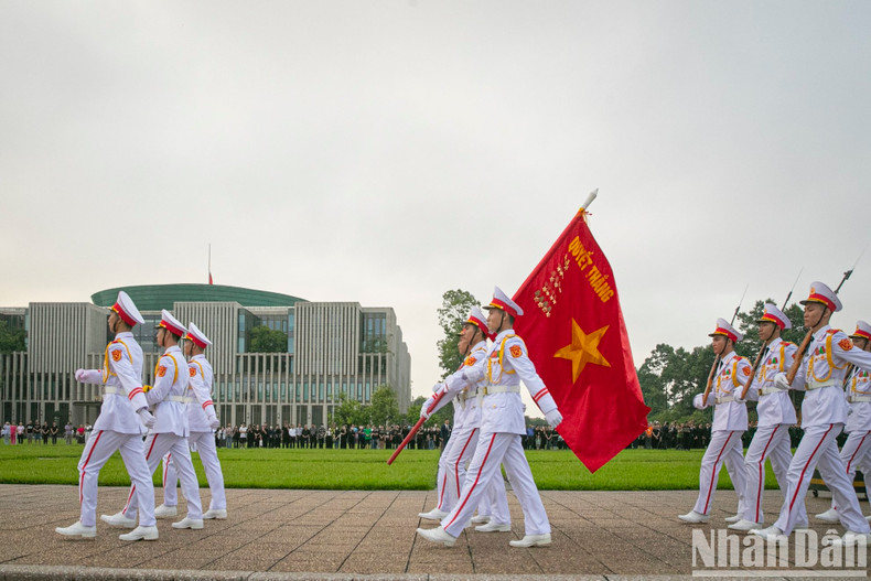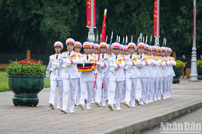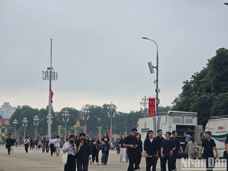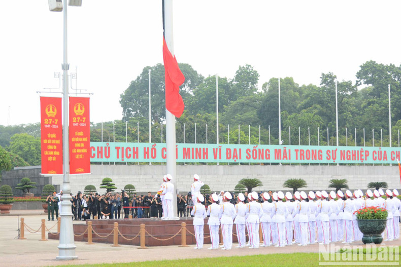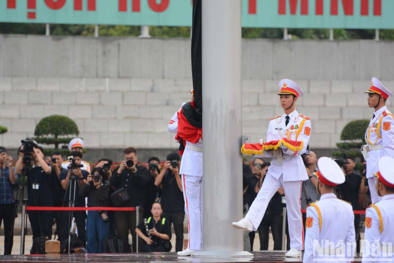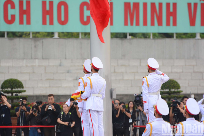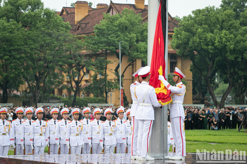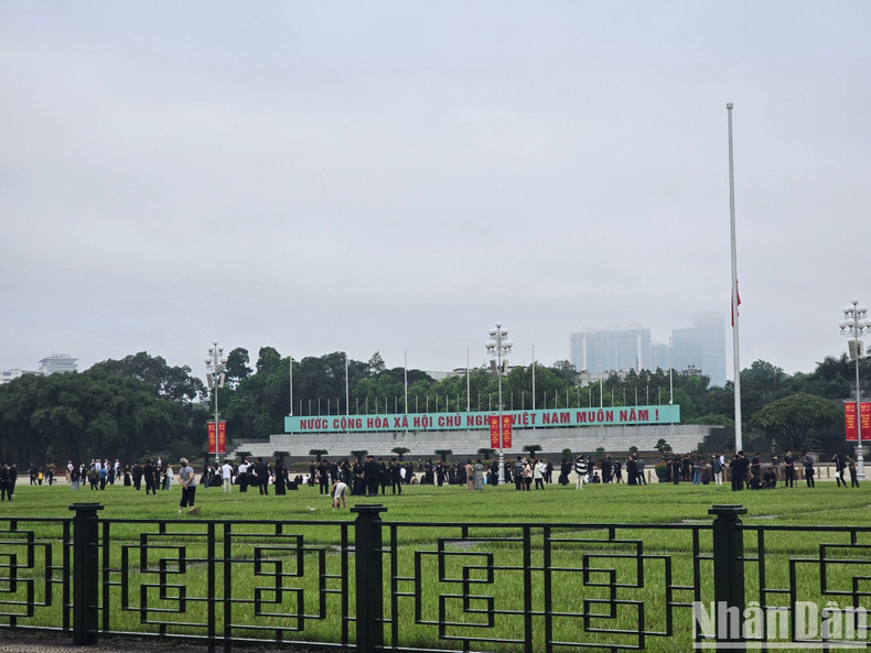La ceremonia de izamiento de bandera nacional a media asta tuvo lugar a las 6:00 horas de hoy en la plaza Ba Dinh en señal de duelo nacional por la defunción del secretario general del Partido Comunista de Vietnam, Nguyen Phu Trong. Miles de personas acudieron a la zona del Mausoleo de Ho Chi Minh para rendir tributo al exinto líder.