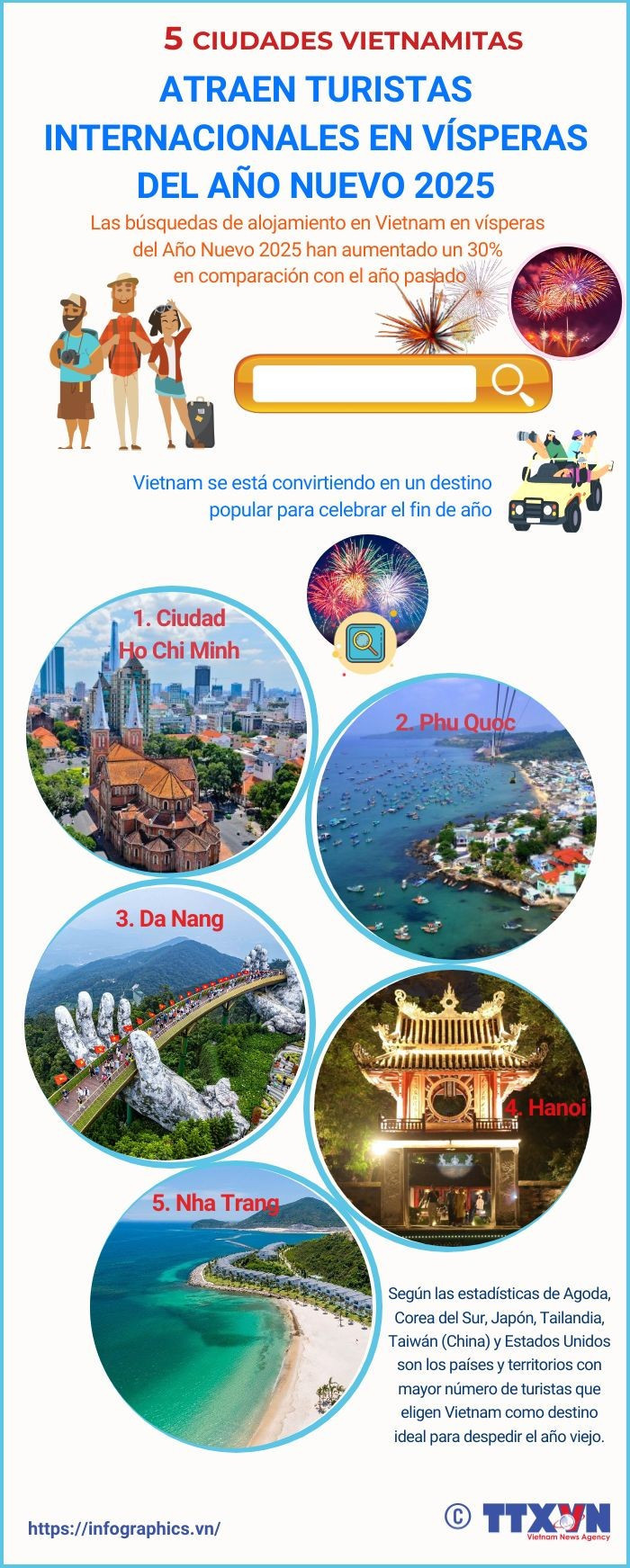 Vietnam sigue reafirmando su posición como destino atractivo en el mapa turístico mundial, cuando el número de búsquedas de alojamiento en vísperas del Año Nuevo 2025 por parte de turistas internacionales aumentó un 30% respecto al mismo lapso del año pasado. Según datos de la plataforma de viajes Agoda, Corea del Sur, Japón, Tailandia, Taiwán (China) y Estados Unidos son los países y territorios con mayor número de vacacionistas que eligen Vietnam como destino ideal para despedir el año viejo.
