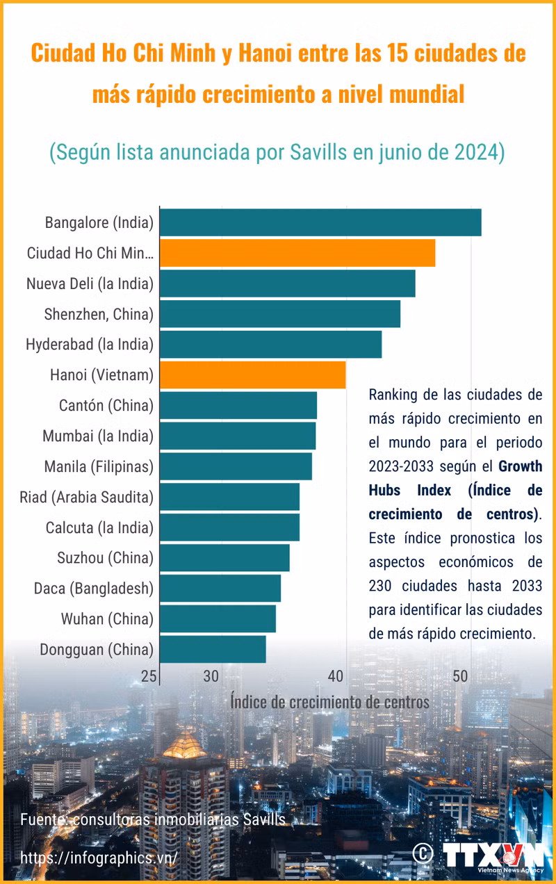 En el ranking de las 15 ciudades que más crecerán en el mundo en 2033 anunciado por Savills, se encuentra dos representantes de Vietnam: Ciudad Ho Chi Minh y Hanói.
