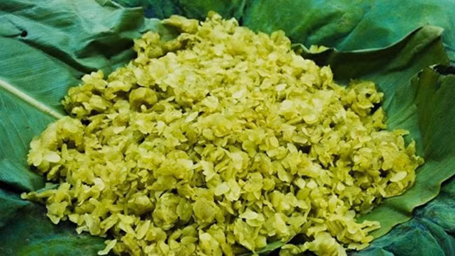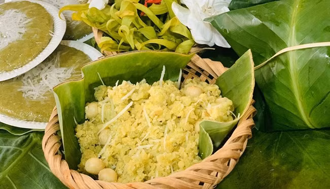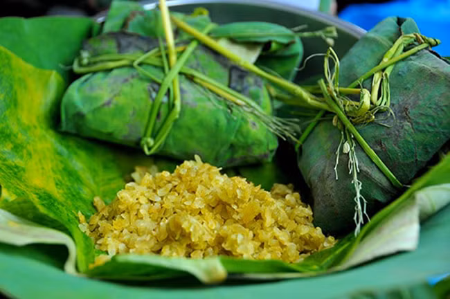 “Banh Com”, un pastel hecho de com, frijoles verdes y coco, también es una comida típica asociada con la capital vietnamita. Esa especialidad, que se suele comer en las bodas, simboliza el deseo de que la pareja tenga una vida feliz y dulce.