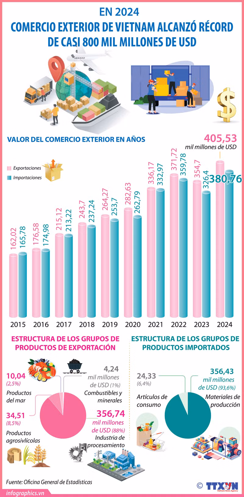 Comercio exterior de Vietnam alcanzó récord de casi 800 mil millones de dólares en 2024