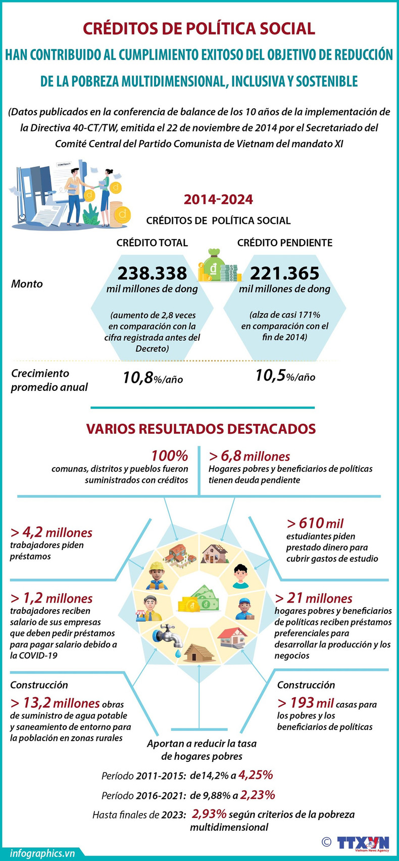 Después de una década de implementación de la Directiva No. 40-CT/TW, del 22 de noviembre de 2014 del Secretariado del Comité Central del Partido Comunista de Vietnam del XI mandato, más de 21 millones de hogares han recibido préstamos preferenciales para desarrollar la producción y los negocios. Esos créditos han ayudado a más de 3,1 millones de hogares a superar el umbral de pobreza.