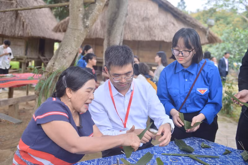 | Los delegados participan en el intercambio cultural con el grupo étnico Ede. |