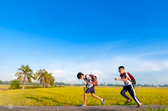 Niños atraviesan campos de arroz para ir a la escuela.