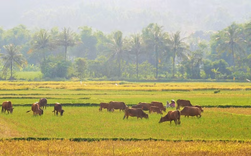 Un rebaño de vacas comen tranquilamente paja después de la temporada de cosecha de arroz en el distrito de Tuy An.