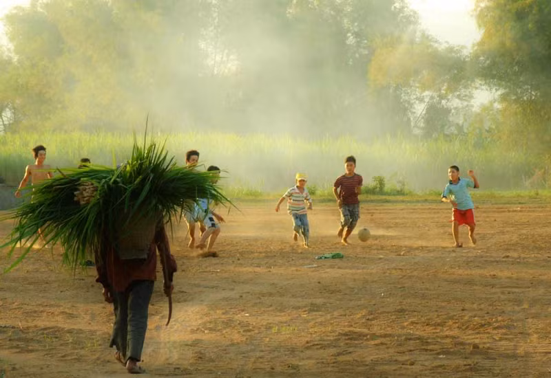 El hombre pasa entre un grupo de niños que juegan a fútbol bajo el sol de la tarde, con caña de azúcar joven cargada en la espalda para alimentar a las vacas.