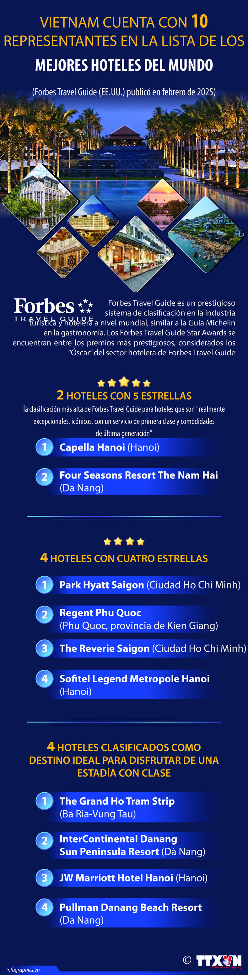 Capella Hanoi (Hanói) y Four Seasons Resort The Nam Hai (Da Nang) son dos representantes de Vietnam entre los mejores hoteles de cinco estrellas del mundo en 2025 votados por la revista estadounidense Forbes Travel Guide.