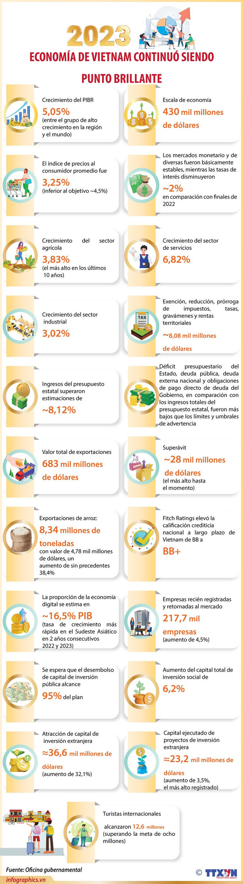 En 2023, la situación económica de Vietnam continuó su tendencia de recuperación, logrando básicamente el objetivo fijado y muchos resultados importantes en todos los campos, y siguió siendo un punto brillante en el panorama de la economía mundial.
