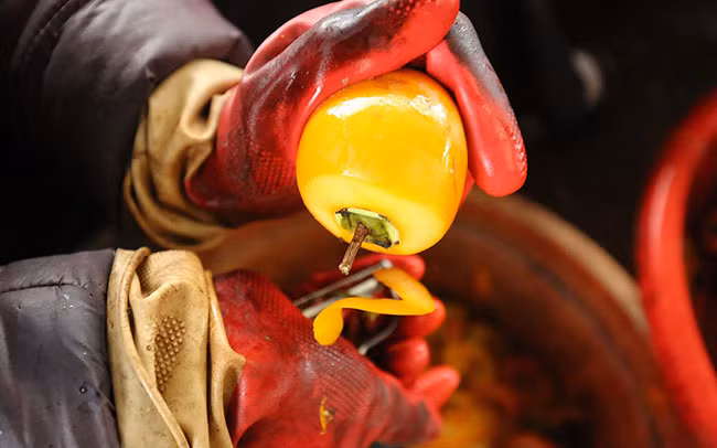 Pelarlos también requiere ciertas técnicas, para que la corteza sea lo más delgada posible y que no se les caiga el pedículo. Luego, las frutas son lavadas otra vez, antes de pasar dos a tres horas en el horno.