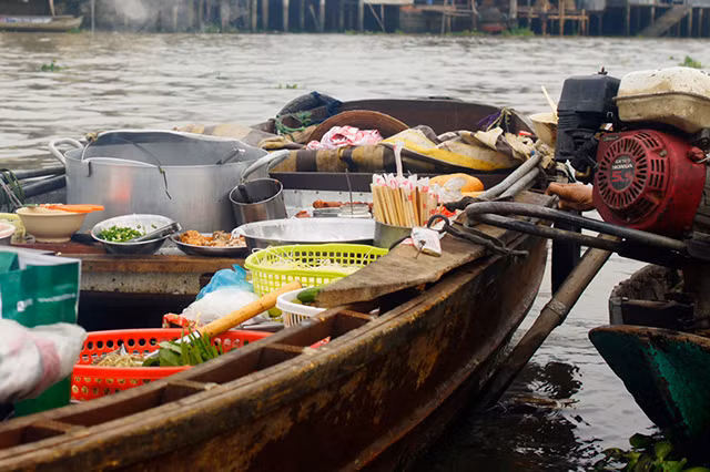 Tiendas en barcos, con una gran variedad de productos, desde carne, pescado y verduras, hasta artículos necesarios para la vida cotidiana como jabón, sal y medicinas, incluso ropa o productos electrónicos.