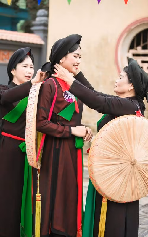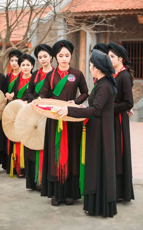 Las muchachas con plena gracia en los trajes tradicionales de actuación de Quan ho: la pañoleta mo qua y el vestido tu than.