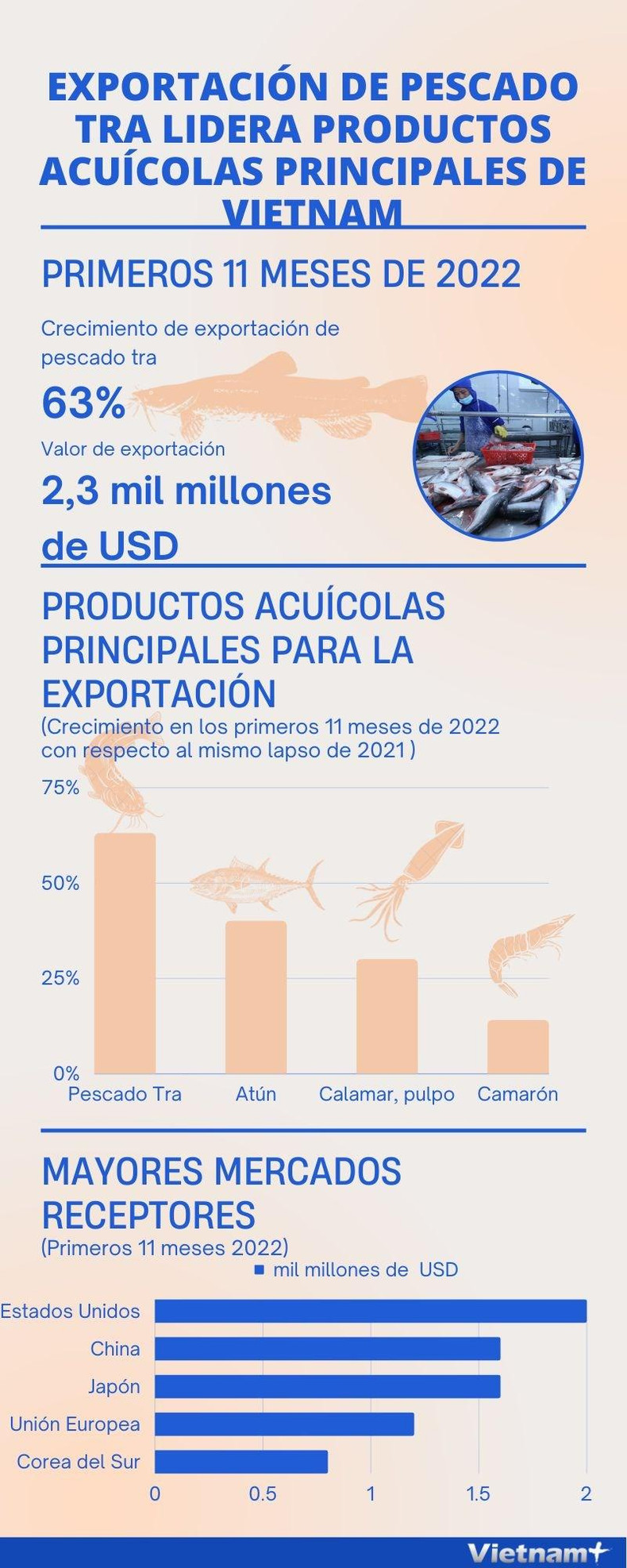 La exportación de pescado Tra lideró los productos acuícolas principales de Vietnam en los primeros 11 meses de 2022.