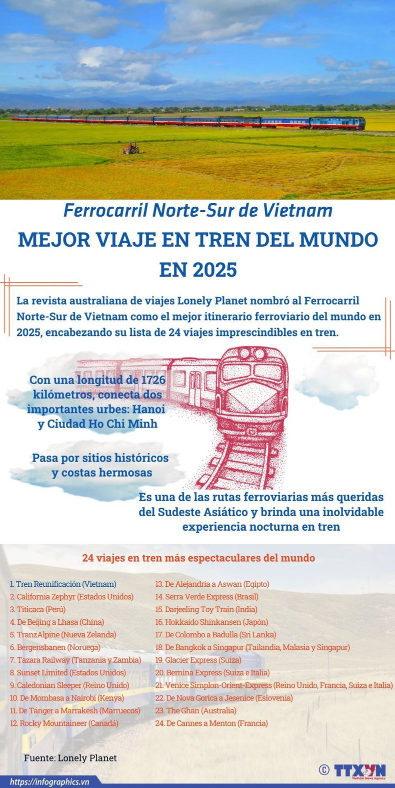 La revista australiana de viajes Lonely Planet nombró al Ferrocarril Norte-Sur de Vietnam como el mejor itinerario ferroviario del mundo en 2025, encabezando su lista de 24 viajes imprescindibles en tren.