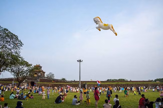Además, de 2:00 a 5:00 de la tarde se ofrecen actuaciones de vuelo de cometas en el área de Phu Van Lau (pabellón de Phu Van) y la plaza de Ngo Mon (Puerta Meridional) de la Ciudadela Imperial de Hue, con participación de clubes de cometas de las tres regiones.