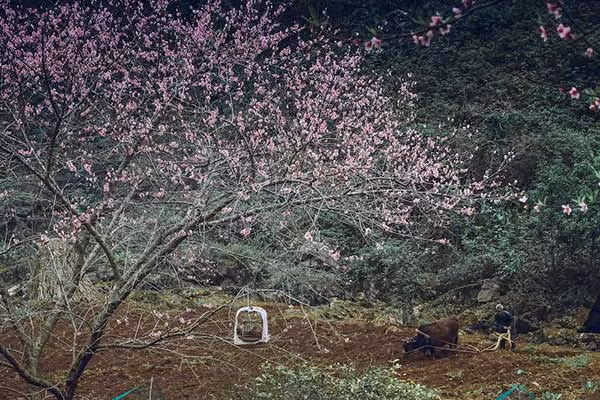 El florecimiento de los duraznos coincide con el momento en que las minorías étnicas locales inician la cosecha de arroz de primavera.