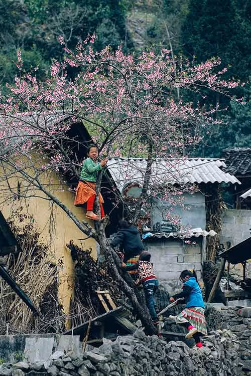 Las imágenes de niños de minorías étnicas trepando por los duraznos inspiran a los fotógrafos a tomar imágenes impresionantes.
