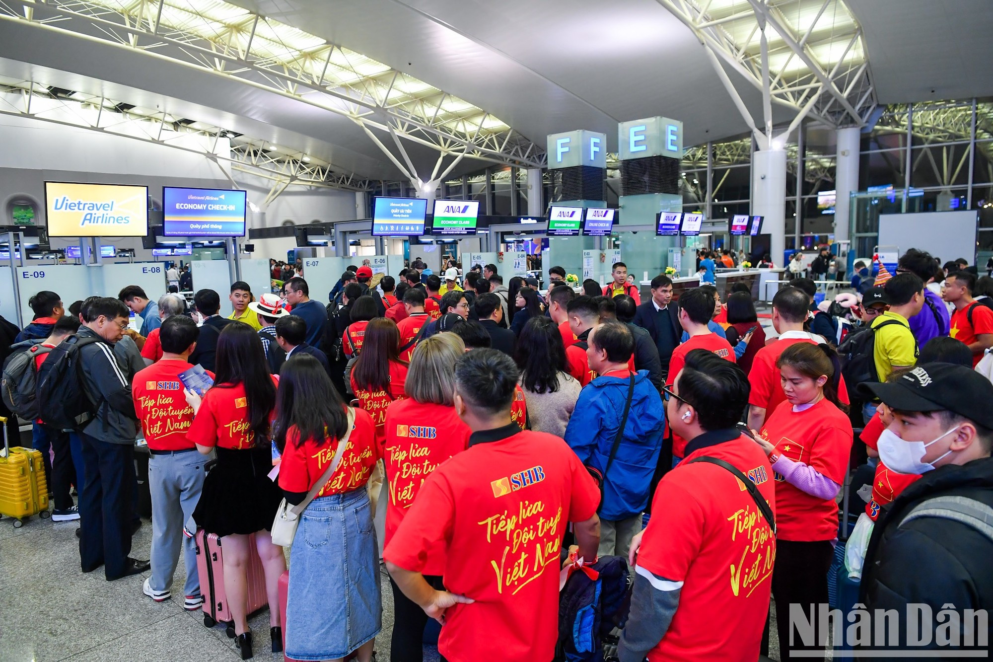 | Los aficionados, que han preparado tambores y banderas nacionales, despegan desde el aeropuerto internacional de Noi Bai, en Hanói. |