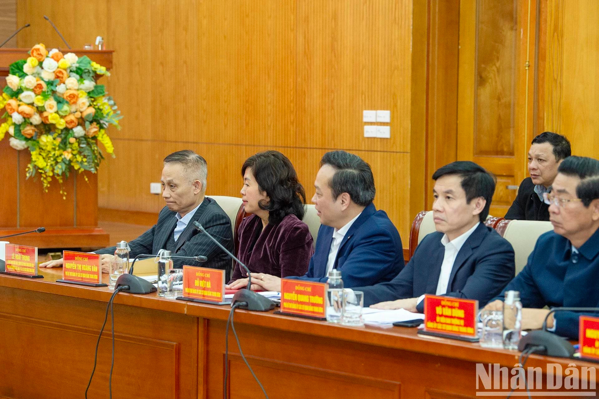 | El miembro del Buró Político y presidente de Vietnam, Luong Cuong, y el miembro del Buró Político, miembro ejecutivo del Secretariado y secretario del Comité partidista de los órganos del Comité Central del PCV, Tran Cam Tu, presiden la reunión. |