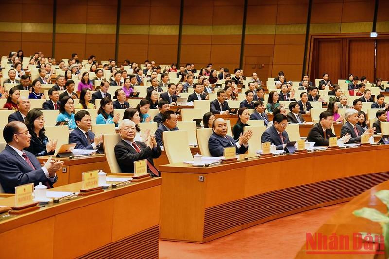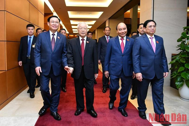 | El secretario general del Partido Comunista de Vietnam, Nguyen Phu Trong, el presidente Nguyen Xuan Phuc, el primer ministro Pham Minh Chinh, el titular del Parlamento Vuong Dinh Hue y otros delegados asistentes a la sesión de apertura. |