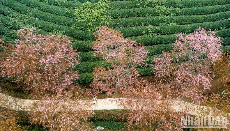 | Los cerezos florecen en las exuberantes colinas de té verde. |
