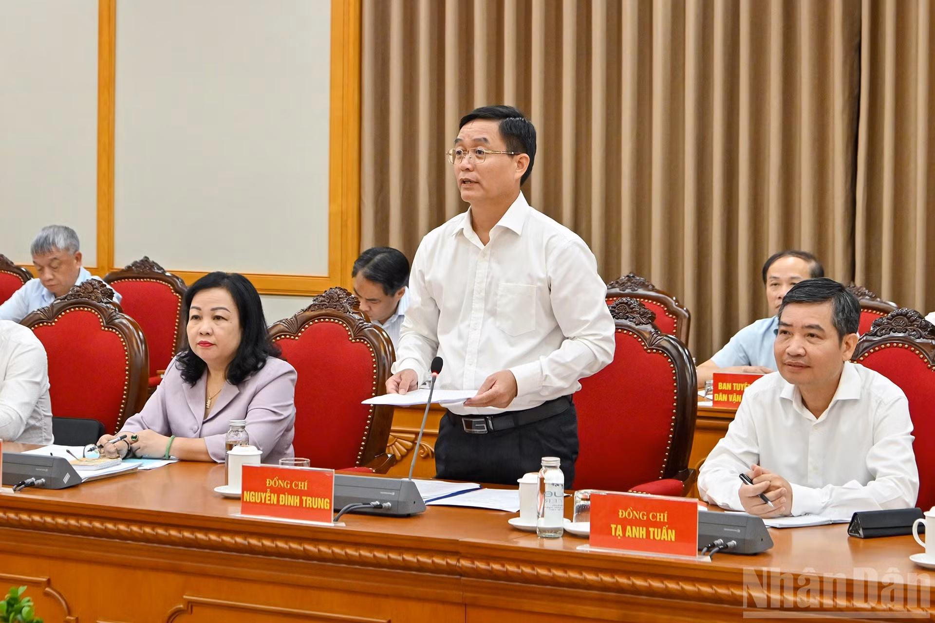 El secretario del Comité del Partido de Ninh Binh, Truong Quoc Huy, interviene en la sesión de trabajo.