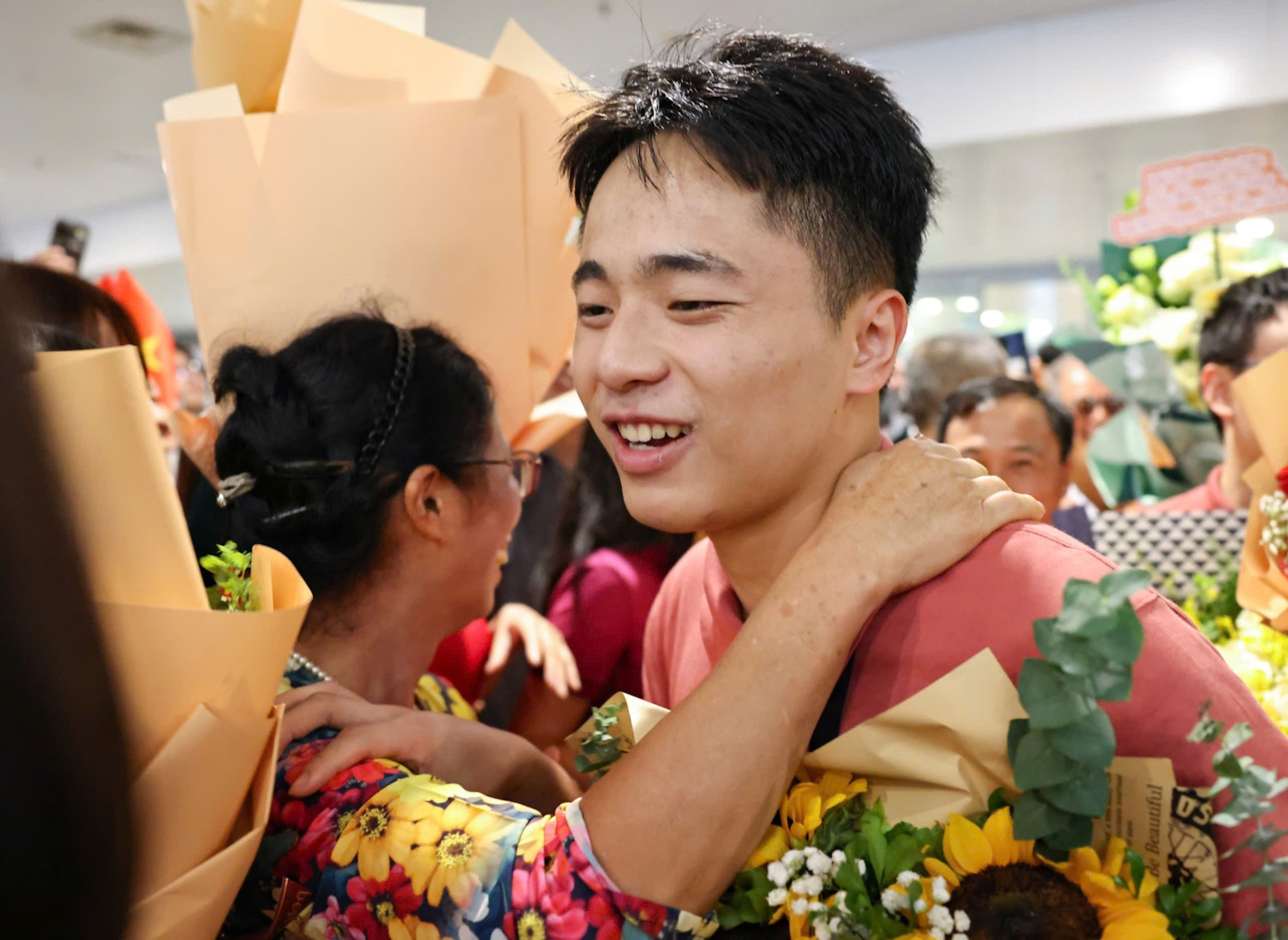 Ngo Quang Minh, el concursante con la puntuación más alta del equipo y ganador de una medalla de oro, se mostró emocionado por la cálida bienvenida de sus seres queridos.