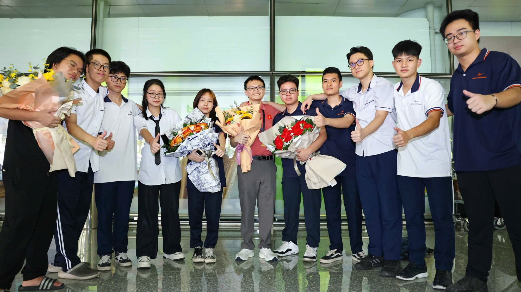 Entre las personas que les dispensaron una cálida bienvenida se encontraba Pham Quoc Khanh, subdirector del Departamento de Gestión de la Calidad del Ministerio de Educación y Formación, junto con representantes de los Servicios de Educación y Formación, maestros, familiares y amigos de los concursantes.